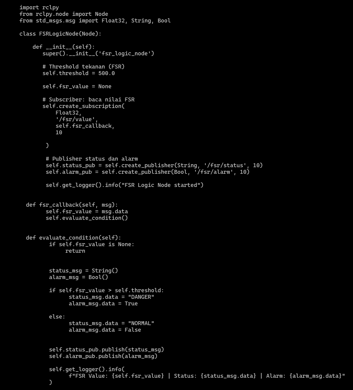 Tahap ini menjelaskan langkah-langkah membuat dan menjalankan Logic Node pada ROS 2 untuk mengelola tekanan serta mengaktifkan alarm jika terdapat tekanan pada sensor.